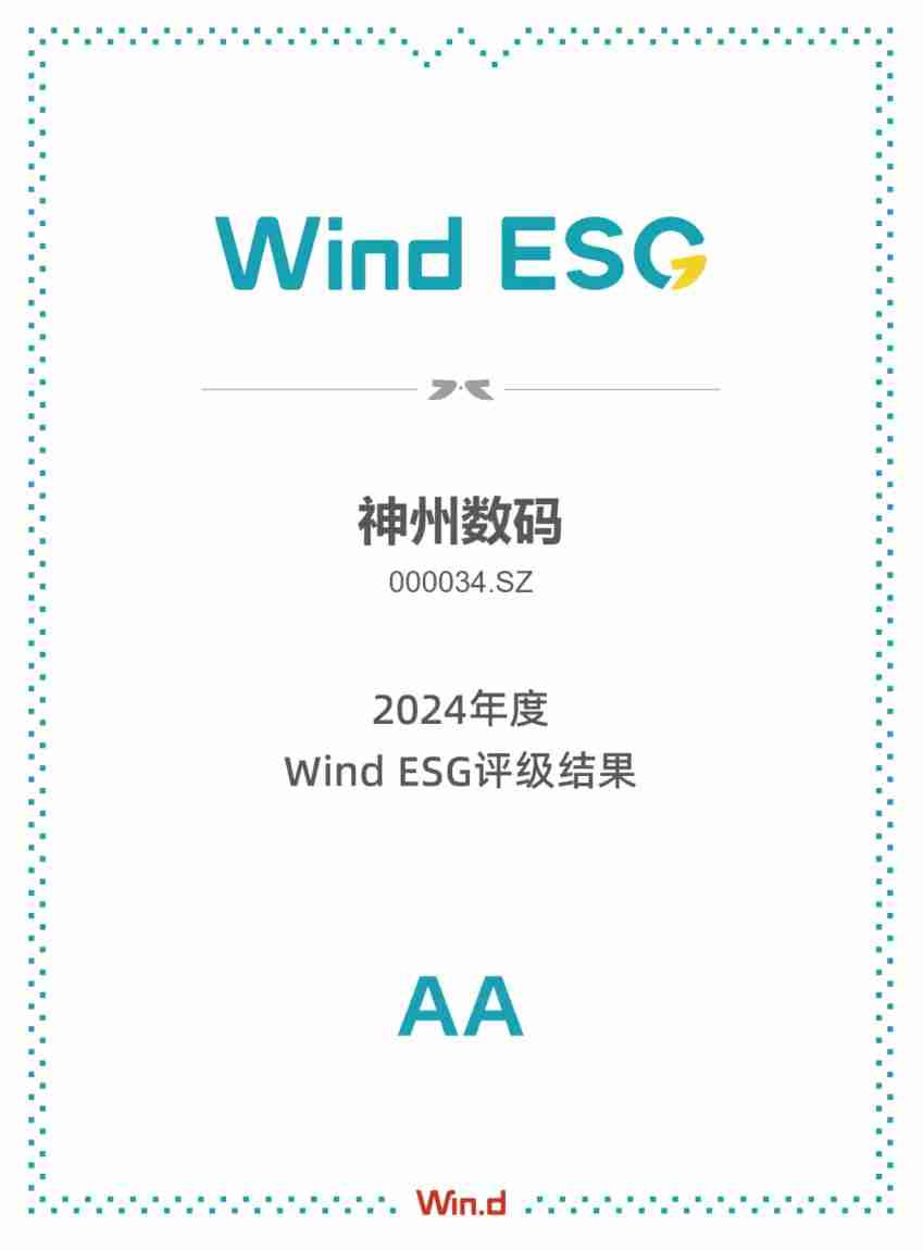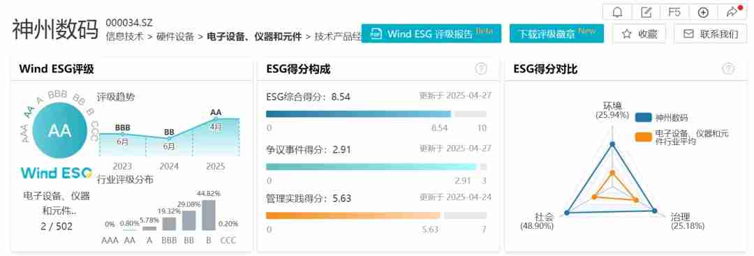 近日,,,,万得(Wind)更新了2024年最新ESG评级结果,,,尊龙时凯数码Wind ESG评级由BB级提升至AA级。。。。在此次评级中,,尊龙时凯数码ESG综合得分为8.54,,,,在电子设备、、仪器和元件行业502家纳评企业中排名第二,,在环境、、、社会、、治理三个维度得分分别为6.95、、8.63、、、8.01,,均处于行业前列,,,充分彰显了其ESG管理水平与可持续发展能力。。。。